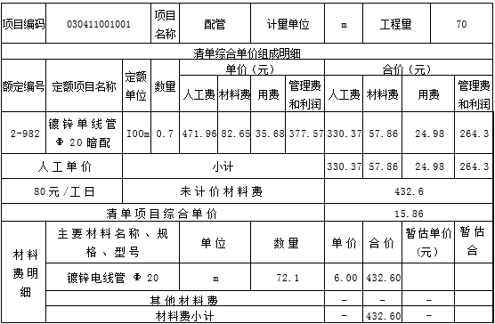 选项 【问题】 1.按照背景资料(4)和图6.Ⅲ所示内容,根据和《建设工程工程量清单计价规范》(GB50500—2013)和《通用安装工程工程量计算规范》(GB50856-2013)的相关规定,列式计算管、线的工程量,将计算结果填入答题纸,在答题纸上表6-Ⅲ-1中编制该工程的“分部分项工程和单价措施项目清单及计价表”。 2.设定该工程镀锌电管线Ф20暗配的清单工程量按照70m计,其余条件均不变。根据上述相关定额,计算Ф20暗配项目的综合单价,并填入答题纸上表6-Ⅲ-2“综合单价分析表”中。