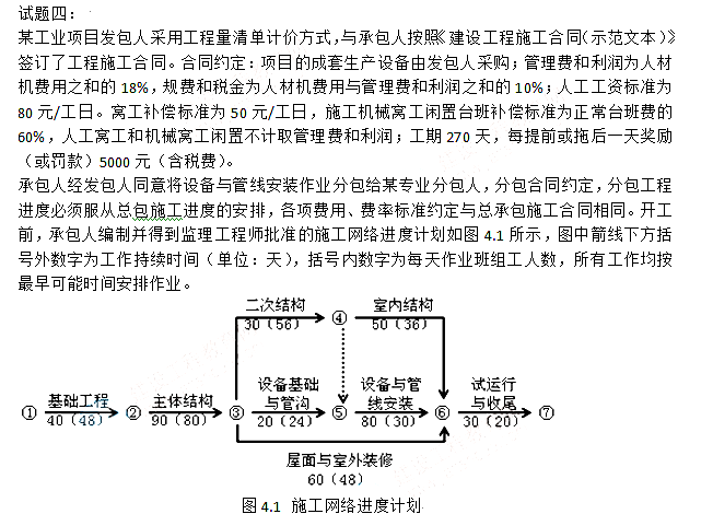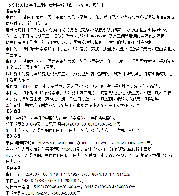 问题 施工过程中发生了如下事件: 事件1:主体结构作业20天后,遇到持续两天的特大暴风雨,造成工地堆放的承包人部分周转材料损失费用2000元;特大暴风雨结束后,承包人安排该作业队中20人修复倒塌的模板及支撑,30人进行工程修复和场地清理,其他人在现场停工待命,修复和清理工作持续了1天时间。施工机械A、B持续窝工闲置3个台班(台班费分别为:1200元/台班、900元/台班)。 事件2:设备基础与管沟完成后,专业分包人对其进行技术复核,发现有部分基础尺寸和地脚螺栓预留孔洞位置偏差过大。经沟通,承包人安排10名工人用了6天时间进行返工处理,发生人材机费用1260元,使设备基础与管沟工作持续时间增加6天; 事件3:设备与管线安装作业中,因发包人采购成套生产设备的配套附件不全,专业分包人自行决定采购补全,发生采购费用3500元,并造成作业班组整体停工3天,因受干扰降效增加作业用工60个工日,施工机械C闲置3个台班(台班费:1600元/台班),设备与管线安装工作持续时间增加3天; 事件4:为抢工期,经监理工程师同意,承包人将试运行部分工作提前安排,和设备与管线安装搭接作业5天,因搭接作业相互干扰降效使费用增加10000元。 其余各项工作的持续时间和费用没有发生变化。 上述事件后,承包人均在合同规定的时间内向发包人提出索赔,并提交了相关索赔资料。
