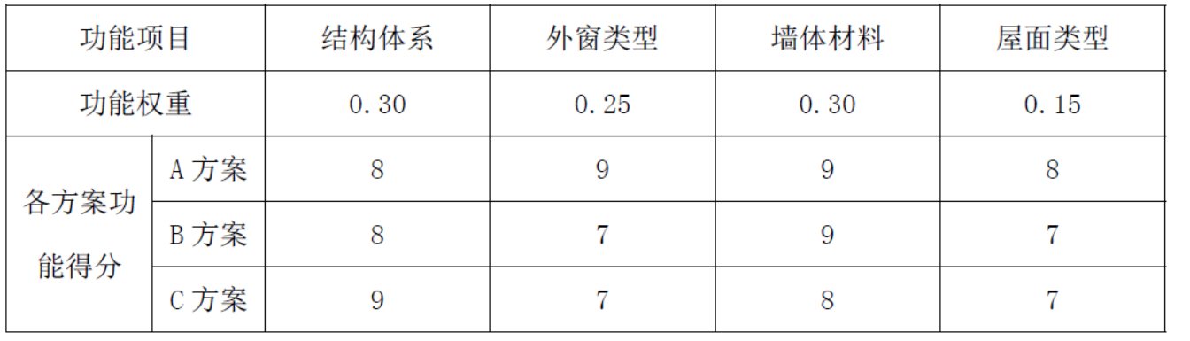 问题 某企业拟建一座节能综合办公楼,建资面积为25000m2,其工程设计方案部分资料如下: A 方案:采用装配式钢结构框架体系,预制钢筋混凝土叠合板楼板,装饰、保温、防水三合一复合外墙,双玻断桥铝合金外墙窗,叠合板上现浇珍珠岩保温屋面。单方造价为2020 元/m2 B 方案:采用装配式钢筋混凝士框架体系,预制钢筋混凝士叠合板楼板,轻质大板外墙体,双玻断桥铝合金外墙窗。现浇钢筋混凝土屋面板上水泥蛭石保温屋面。单方造价为1960 元/m2 C 方案:采用现浇钢筋混凝士框架体系,现浇钢筋混凝土楼板,加气混凝土砌块铝板装饰外操体,外墙窗和屋面做法同B 方案。单方造价为1880 元/m2。 各方案功能权重及得分,见表2.1 问题: 1.简述价值工程中所述的“价值(V)”的含义。对于大型复杂的产品,应用价值工程的重点是在其寿命周期的哪些阶段? 2.运用价值工程原理进行计算,将计算结果分别填入答题卡表2.1、2.2、2.3 中,并选择最佳设计方案。 3.若三个方案设计使用寿命均按50 年计,基准折现率为10%,A 方案年运行和维修费用为78 万元,每10年大修一次,费用为900 万元。已知B、C 方案年度寿命周期经济成本分别为664.222万元和695.400万元,其他有关教据资料见表2.2“年金和现值系数表”,列式计算A 方案的年度寿命周期经济成本,并运用最小年费用法选择最优设计方案。