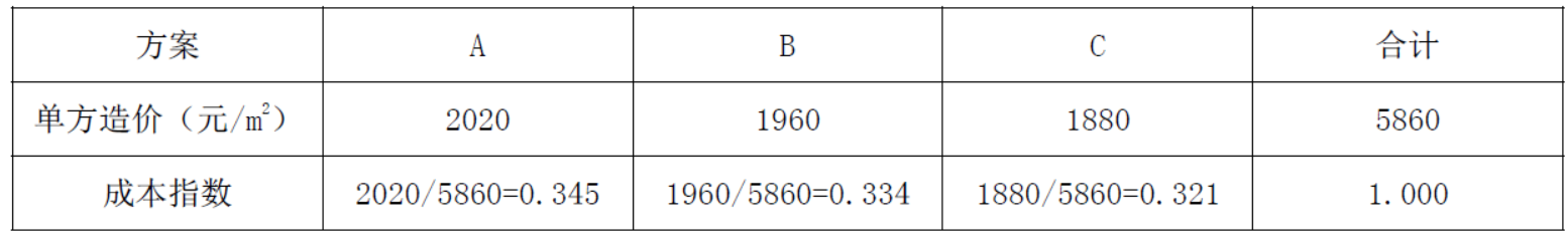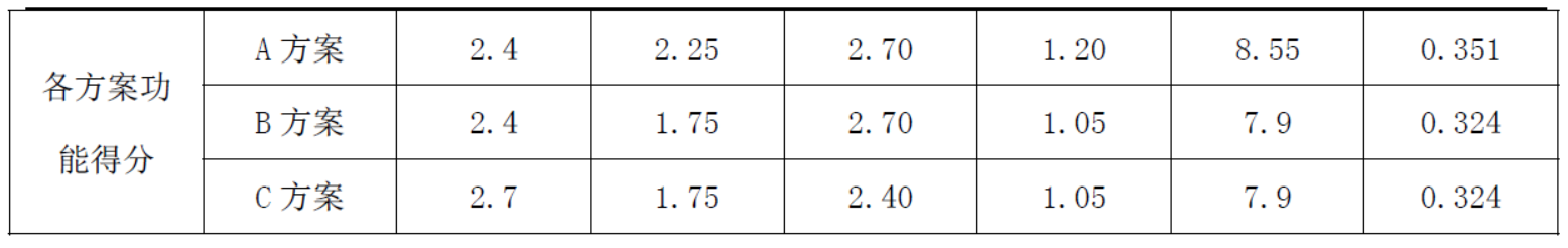 解析 1.价值工程中所述的“价值”是指作为某种产品(或作业)所具有的功能与获得该功能的全部费用的比值。 对于大型复杂的产品,应用价值工程的重点在产品的研究、设计阶段。 2. 表2.1 功能指数计算表 表2.2 成本指数计算表 表2.3 价值指数计算表 由表2.3 的计算结果可知,A 方案的价值指数最高,为最优方案。 A 方案的年度寿命周期经济成本:78+{900×[(P/F,10%,10)+(P/F,10%,20)+(P/F,10%,30)+(P/F,10%,40)]×(A/P,10%,50)+25000×2020、10000×(A/P,10%,50)}=78+[900×(0.386+0.149+0.057+0.022)]×1/9.915+5050×1/9.915=643.063(万元) 结论:A 方案的寿命周期年费用最小,故选择A 方案为最佳设计方案。