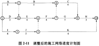 解析 (1)根据工作F、J使用的同种机械只能租赁到1台的约束条件,调整网络进度计划,注意虚工作的添加,选择最优施工方案;进而计算计划工期和关键工作。 (2)根据背景资料,由于开工后发生相关事项,计算该工程的总工期和综合费用增加额。 (3)从经济的角度考虑,进行网络费用优化。 [解析] 问题(1): 从工期控制的角度,先施工工作J,后施工工作F较合理。因为根据约束条件,可有两个备选方案:方案1是先工作J后工作F计算的工期为21天;方案2是先工作F后工作J计算的工期为22天。方案1较合理。 调整结果绘制成新网络图,如图2-11所示。 调整后的关键线路有两条:①→②→④→⑥→⑦→⑨→⑩,①→③→⑤→⑥→⑦→⑨→⑩;关键工作有:A、E、F、G、H、I、J,工期为21天。 问题(2): 由于工作I的时间延误,使工作J的开始作业时间推迟3天,由于是关键工作,则该工程的总工期将为21+3=24(天);综合费用增加:500 × 3+700 ×3=3600(元) 问题(3): 工作J已经推迟3天情况后, 从经济角度,①首先压缩G工作1天, 综合费用增加变为500×3+400+700 ×2=3300(元) ②其次再同时压缩G工作和C工作各1天, 综合费用增加变为500×3+400×2+200+700=3200(元) ③由于压缩H工作1天增加的费用750元大于延长1天罚款700元,从经济角度考虑,不再压缩。 结论:压缩G工作2天;压缩C工作1天,总工期22天,增加的综合费用为3200元。