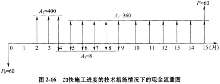 解析 (1)根据背景资料,确定现金流量发生的时点,正确画出现金流量图。特别注意的是每月工程款均于下月末支付。原合同工期16个月,工程款支付在第2月至第17月。 (2)熟练应用资金等值计算公式。特别是等额分付现值公式(已知A,求P)和一次支付现值公式(已知F,求Po) (3)根据背景资料,正确确定备选方案。本案例应确定三个备选方案。 [解析] 问题(1): 基础工程每月工程款A1=1200/4=300(万元) 基础工程每月工程款的现值为: PV1=A1(P/A,1%,4)(P/F,1%,1)=300×3.902×0.990=1158.89(万元) 主体结构工程每月工程款A2=3960/12=330(万元) 主体结构工程每月工程款的现值为: PV2=A2(P/A,1%,12)(P/F,1%,5)=330×11.255×0.951=3532.16(万元) 问题(2): 该承包人可采用以下三种加快施工进度的技术措施方案: 方案1:仅加快基础工程的施工进度,则该工程方案的现值为: PV1=-60+400(P/A,1%,3)(P/F,1%,1)+330(P/A,1%,12)(P/F,1%,4)+30(P/F,1%,16) =4699.53(万元) 方案Ⅱ:仅加快主体结构工程的施工进度,则该工程方案的现值为: PVⅡ=300(P/A,1%,4)(P/F,1%,1)+360(P/A,1%,11)(P/F,1%,5)+30(P/F,1%,16)-8(P/A,1%,6)(P/F,1%,4) =4689.52(万元) 方案Ⅲ:既加快基础工程的施工进度,又加快主体结构工程的施工进度,则该工程方案的现值为: PVⅢ=-60+400(P/A,1%,3)(P/F,1%,1)+360(P/A,1%,11) (P/F,1%,4)+60(P/F,1%,15)-8(P/A,1%,6)(P/F,1%,3) =4698.19(万元) 由计算结果:PVI=4699.53(万元);PVⅡ=4689.52(万元);PVⅢ=4698.19(万元),得出仅加快基础工程施工进度的技术措施方案能获得较大收益。 问题(3): 基础工程和主体结构工程均采取加快施工进度的技术措施情况下的现金流量图,见图2-16。