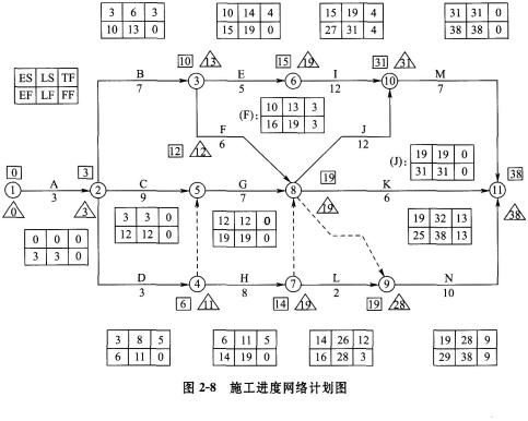 问题 某市政工程发包方与承包方签订了施工合同。经总监理工程师批准的施工总进度计划如图2-6所示(时间单位:周),各工作可以缩短的时间及其增加的赶工费如表2—13所示,其中H、L分别为道路的路基、路面工程。 问题: 1.施工过程D、G、N三项工作需依次使用施工单位仅有的一台施工机械,在施工总进度计划图中用图示表述这一要求。在调整后的施工进度网络计划图中,标示节点最早时间(□),节点最迟时间(△);标示各工序MS、EF、LS、LF、TF、FF。确定关键线路,确定计划工期。 2.说明在D、G、N共用一台施工机械的正常在场时间、闲置时间,说明机械在场时间最短的合理方案。 3.开工一周后,建设单位要求将总工期缩短2周,监理单位与施工单位共同研究在支付赶工费用最少且能满足建设单位要求的施工进度调整方案,请你提出自己认为合理的方案,并说明理由。 4.建设单位依据调整后的方案与施工单位协商,并按此方案签订了补充协议,施工单位修改了施工总进度计划。在H、L工作施工前,建设单位通过设计单位将此400m的道路延长至600m。请问该道路延长后,H、L工作的持续时间为多少周(设工程量按单位时间均值增加)?对修改后的施工总进度计划的工期是否有影响?为什么? 5.在H、L工作工程量调整后,建设单位提供的施工条件发生了变化,导致J、K、N三项工作分别拖延1周,为确保工程按期完成,如果要求施工单位赶工需支付赶工费用,也可以采取延期完工方式。如果该项目投入使用后,每周净收益为5.6万元,从建设单位的角度应采用什么方案? 6.发包方在施工过程中提出增加一项附加施工要求(w),承包方按正常施工时间提出了包括三个施工过程的进度横道图,见图2—7。 发包方要求附加施工必须在8日内完成,承包方该如何调整施工进度?