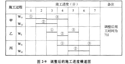 解析 问题1: 由题设条件知D、G、N三项工作共用一台施工机械,调整网络图的方法是:由先用设备工序的结束点向后用设备工序开始点加入虚工序表示线,但加入后必须保持网络图中的序号规则,不能破坏各工序之间原有的紧前紧后逻辑关系。 同题2:根据问题1计算结果可知,D工作ES=4,N工作EF=29。 多工序共用设备在场时间=最后使用设备工序EF-最先使用设备工序ES=29-3=26(周) 工序作业时间等于D、G、N三个工序作业时间之和(3+7+10),为20周,设备闲置时间为 6周。 合理方案为:D工作为非关键工序,令其开始作业时间向后推迟(由于G工作为关键工序,其作业时间不能调整),至开工后第9周末进场。作业3周后,继续完成G工作。完成三项工作设备在场时间为20周。 问题3:根据本题题设条件可知:压缩总工期应选择费用变动率最小的关键工序,压缩工序工期。C、G、J、M工作均可压缩其工作时间,对各工序组合情况分析结果如下: 根据表2—13所示各项工作的每周赶工费,在关键工作中以G和M工作的赶工费最低,其可压缩时间各为1周,所以最佳的赶工方案为压缩G和M各1周时间,则赶工后的工期为T=3+9+(7-1)+12+(7-1)=36(周)可以满足要求。 问题4:延长道路后的工作H和L的工作持续时间分别为: tH=8×600/400=12(周),增加了4周, tL=2×600/400=3(周),增加了1周, 共增加5周。 由于H工作TF=5,L工作TF=12,H、L增加工程量和工作时间对总进度计划工期没有影响。 问题5: J工作为关键工作,K工作TF=13,N工作TF=9。J工作延误影响总工期,而M工作也为关键 工作,且增加赶工费用少。该三项工作时间的增加,只有J工作对原工期影响1周,其他工作无影响。若将M赶工1周,则增加费用为0.8万元/周,而提前1周可获得收益5.6万元/周。 因此赶工1周合理,可获得收益5.6-0.8=4.8(万元/周)。 问题6: 承包方决定对附加施工进行调整,组织加快的成倍节拍流水施工将用工时间调整为7日。调整后的施工进度横道图见图2—9。