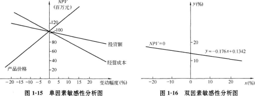 解析 问题1: (1)设投资额为K,年营业收入为R,年经营成本为C,年增值税及附加为TA,期末残值为S, 设投资额变动百分比为x;经营成本变动的百分比为y;产品变动的百分比为z。 进行确定性分析,计算净现值(NPV)的初始值: 因此,方案在经济上是合理的。 (2)分析投资额、经营成本和产品价格变动对方案净现值影响.列出计算式: NPV=-K(1+x)+(R-TA-C)(P/A,10%,10)(p/F,10%,1)+S(P/F,10%,11) NPV=-K+[R-TA-C(1+y)](P/A,10%,10)(P/F,10%,1)+S(P/F,10%,11) NPV=-K+[(R-TA)(1+z)-C](P/A,10%,10)(P/F,10%,1)+S(P/F,10%,11) 将表1—21中的数据代入上述三个公式,并分别取不同的x,y,z值,可以计算出各不确定因素在不同变动率下的净现值。计算结果见表1—22。 从表1—22中的数据分析可知,三个因素中产品价格的变动对净现值的影响最大,产品价格平均变动1%,净现值平均变动1105.95万元;其次,是经营成本;投资额的变动对净现值的影响最小。 根据计算所得数据,绘出每个不确定因素的敏感趋势曲线,见图1—15、图1—16。 分别计算出当NPV=0时,x=76.0%,y=13.4%,z=-10.3%,即投资额与经营成本不变,产品价格低于预期值的10.3%以上;投资额与产品价格不变,经营成本高于预期值的13.4%以上,方案将变得不可接受。 问题2: 列出考虑投资额与经营成本两个因素的变动对净现值影响的计算公式: NPV=-K(1+x)+[R-TA-C(1+y)](P/A,10%,10)(P/F,10%,1)+S(P/F,10%,11) NPV=11396-15000x-84900y 取NPV的临界值,即令NPV=0,则有 NPV=11396-15000x-84900y=0 11396-15000x-84900y=0 y=-0.176x+0.1342 在x—y坐标系中作出上述直线,即NPV=0的临界线,见图1—16。该直线将x—y平面分为两个区域:在临界线左下方区域NPV>0;在临界线右上方区域NPV<0,投资额与经营成本同时变动范围不超出临界线左下方的区域(包括临界线上的点),方案都是可以接受的。 解析: 本案例主要考查敏感性分析及相关知识要点,主要包括:单因素敏感性分析的步骤、双因素敏感性分析的原理,解答时应特别注意计算的准确性。此类题型的规范解题程序及知识要点参见图1-14。 问题1首先计算得出基本方案的净现值指标;分别就投资、销售收入、经营成本三个不确定因素在不同的变动幅度下的净现值,找出其中最敏感的因素。根据计算所得数据,绘出每个不确定因素的趋势曲线。 问题2以投资额和经营成本的变化率为变量,列出净现值计算式,令其为0,整理得到以变化率为变量的直线方程。在x—y坐标系中绘出净现值为0的临界线,即得到投资额与经营成本同时变动的范围。