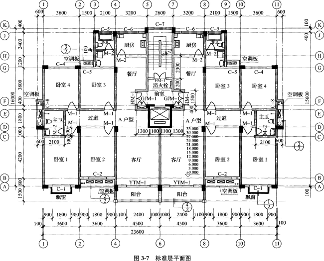 一、某小高层住宅楼建筑部分设计如图3—7和图3—8所示,共12层,每层层高均为3m,电梯机房与楼梯间部分凸出屋面。墙体除注明者外均为200mm厚加气混凝土...