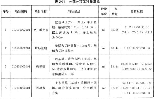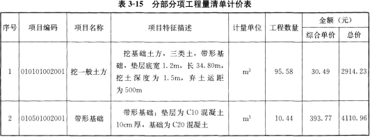 问题 某工程项目基础工程如图34、图3-5所示,已知土壤类别为三类土,混凝土为现场搅拌,其强度等级基础垫层为C10,带形基础为C20,砖基础为M5,水泥砂浆砌筑MV15机砖,防潮层为1:3,水泥砂浆抹面2cm厚,弃土运距为500m,基础回填土为夯填,土方挖、运计算均按天然密实土。 某承包商拟参加投标,确定该基础工程为人工开挖,工作面每边留30cm,自垫层混凝土上表面开始放坡,放坡系数为0.33,槽边可堆土105.00m3,余土用翻斗车外运,运距为500m。 该承包商的企业定额中的人工材料机械消耗量如下:挖1m3沟槽用工0.52工日(包括槽底钎探用工),装运(外运500m)1m3土方,用工0.15工日,翻斗车0.080台班,已知人工单价为26元/工日,翻斗车台班单价为78.69元/台班。 现浇混凝土垫层,每立方米混凝土用工1.31工日,人工单价26元/工日,材料费合计为208.03元,机械费合计1.10元。 现浇混凝土C20带形基础每立方米用工0.65工日,日工资单价为32元/工日,材料费合计为229.43元,机械费为1.30元。 砖基础每立方米用工1.22工日,日工资单价为32元,/工日,材料费合计146.30元,机械费为2.60元。 基础上抹1:3水泥砂浆防潮层,每平方米用工0.09工日,日工资单价32元/工日,材料费合计6.30元,机械费0.35元。 土方回填(基础)每立方米用工0.22工日,日工资单价为26元/工日,机械费为1.25元。 问题: 1.根据图示内容和《建设工程工程量清单计价规范》的规定,并根据表3—12所列分部分项工程量清单项目编制±0.00以下部分的工程量清单,并将计算过程及结果填入表313中。 2.计算:①人工挖沟槽、余土外运;②C10现浇砖垫层,C20带形基础;③砖基础、抹防潮层;④土方回填(基础)各项工作的直接工程费及综合单价。填写分部分项工程量清单计价表。 3.假定措施项目费用为分部分项工程费用的15%,利润率为4.5%,管理费率为8%(管理费的计算基数为人材机费用之和,利润的计算基数为人材机费和管理费之和),规费费率为不含税的人材机费、管理费、利润之和的6%,增值税率为不含税的人材机费、管理费、利润、规费之和的3%。按照《建设工程工程量清单计价规范》的规定,确定该基础工程报价。