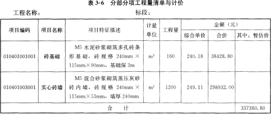 问题 某工程采用工程量清单招标。按工程所在地的计价依据规定,措施费和规费均以分部分项工程费中的人工费(已包含管理费和利润)为计算基础,经计算,该工程的分部分项工程费总计为6300000元,其中人工费为1260000元。其他有关工程造价方面的背景材料如下: 1.条形砖基础工程量为160m3,基础深3m,采用M5水泥砂浆砌筑,防潮层采用1:2水泥砂浆掺0.5防水剂,多孔砖的规格为240mm×115mm×90mm。实心砖内墙工程量为1200m3,采用M5混合砂浆砌筑,蒸压灰砂砖的规格为240mm×115mm×53mm,墙厚240mm。 现浇钢筋混凝土矩形梁模板及支架工程量为420m2,支模高度为2.6m。现浇钢筋混凝土有梁板模板及支架工程量为800m2,梁截面为250mm×400mm,梁底支模高度为2.6m,板底支模高度为3m。 2.安全文明施工费费率为25%,夜间施工费费率为2%,二次搬运费费率为1.5%,冬、雨季施工费费率为1%。 按合理的施工组织设计,该工程需大型机械进出场及安拆费26000元,工程定位复测费2400元,已完工程及设备保护费22000元,特殊地区施工增加费120000元,脚手架费166000元。以上各项费用包含管理费和利润。 3.招标文件中列明,该工程暂列金额330000元,材料暂估价100000元,计日工费用20000元,总承包服务费20000元。 4.社会保障费中的养老保险费费率为16%,失业保险费费率为2%,医疗保险费和生育保险费费率为6%;住房公积金费率为6%;工伤保险费费率为0.48%。增值税率为不含税的人材机费、管理费、利润、规费之和的3%。 问题: 依据《建设工程工程量清单计价规范》的规定,结合工程背景材料及所在地计价依据的规定,编制招标控制价。 1.编制砖基础和实心砖内墙的分部分项清单及计价,填入表3—6分部分项工程量清单与计价表。 项目编码:砖基础:010401001,实心砖内墙:010401003;综合单价:砖基础240.18元/m3,实心砖内墙249.11元/m3。 2.编制工程措施项目清单及计价,填入表37措施项目清单与计价表(一)和表3—8措施项目清单与计价表(二)。补充的现浇钢筋混凝土模板及支架项目编码:梁模板及支架AB001,有梁板模板及支架AB002;综合单价:梁模板及支架25.60元/m2,有梁板模板及支架23.20元/m2。 3.编制工程其他项目清单及计价,填入表3—9其他项目清单与计价汇总表。 4.编制工程规费和税金项目清单及计价,填入表3—10规费、税金项目清单与计价表。 5.编制工程招标控制价汇总表及计价,根据以上计算结果,计算该工程的招标控制价,填人表3—11单位工程招标控制价汇总表。 (计算结果均保留2位小数)