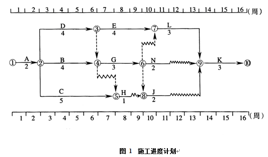 某工程的施工合同工期为16周,项目监理机构批准的施工进度计划如图 1所示(时间单位:周)。各工作均按匀速施工。施工单位的报价单(部分)见表 1。 表...
