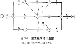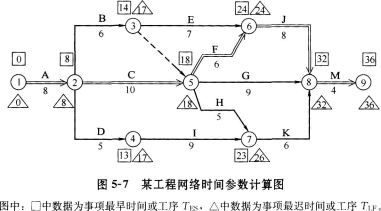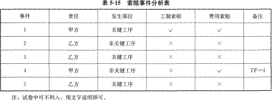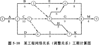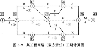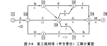 解析 问题1: 问题2: 事件1:发生在关键工序,甲方责任按计划工期8天平均每天完成50m3,现实际工程量增加100m3,默示工期增加2天应予顺延。土方量由,100m3增加到500m3,即[500=400×(1+15%)+40]应增加工程费为:80×60+80×0.9×40=7680(元)。 事件4:发生在非关键工序I,甲方延误责任,虽延误3天(本工序TF=4,其紧后工序为K,TF=3)对总工期无影响故工期不予补偿,费用补偿3万元。 事件2、3、5:均为乙方责任,故不予工期补偿和费用补偿。 问题3: 包含甲方责任延误工期时间的甲方责任工期为38天。 B工作增加工程量100m3默示工期增加2天。 包含甲、乙双方延误时间的实际工期为40天,排除甲方责任工期38天,剩余2天,即为由于乙方责任延误工期。故乙方应向甲方交付误工费2万元。 问题4: C、I共用1台设备可用图5-5表示,C工序最早开工时间TES=8,I工序最早开工时间了TES=18,最早完工时间TEF=27,故正常情况下起重机在场时间为27-8=19(天)。 在甲方延误责任的前提下,C工序TES=9,TEF=19;I工序TES=19,TEF=31;故起重机在场时间为31-9=22(天),(22-19=3)比正常情况下增加了3天。 若起重机为乙方自有,应分别按原定台班费定额(工程量增加)或设备折旧值(窝工)给予费用 补偿。若起重机为乙方租赁应分别按原定台班费定额或租金给予费用补偿。 费用补偿时不应支付机上工作人员工资费用,因此项费用已包含在机械台班费定额中。