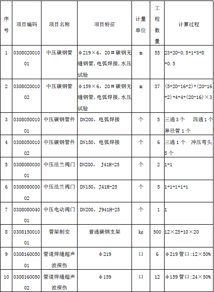 问题 Ⅱ. 管道和设备工程 某一化工生产装置中部分热交换工艺管道系统,如图6.Ⅱ.1 所示。 设计说明 1.某一化工厂生产装置中的部分热交换工艺管道系统如图所示,图中标注尺寸标高以m?计,其他均以mm?计。该管道系统工作压力为2.OMPa。 2.管道:采用20#碳钢无缝钢管,管件:弯头采用成品冲压弯头,三通、四通现场挖眼连接,异径管现场摔制。 3.阀门、法兰:所有法兰为碳钢对焊法兰;阀门型号除图中说明外,均为J41H—25,采用对焊法兰连接;系统连接全部为电弧焊。 4.管道支架为普通支架,其中:Φ219×6 管支架共12 处,每处25kg,Φ159×6 管支架共10 处,每处20kg。支架手工除锈后刷防锈漆、调和漆两遍。 5.管道安装完毕作水压试验,对管道焊口按50%的比例作超声波探伤,其焊口总数为:Φ219×6 管道焊口12 个、Φ159×6 管道焊口24 个。 6.管道安装就位后,所有管道外壁手工除锈后均刷防锈漆两遍,采用岩棉管壳(厚度为60mm)作绝热层,外包铝箔保护层。 问题: 1.根据图6.Ⅱ.1 所示内容和《通用安装工程工程量清单计算规范》的规定和表6.Ⅱ.1 所列的分部分项工程量清单的统一项目编码,编制分部分项工程量清单(不含法兰有关分项),并将计算过程及结果填入表6.Ⅱ.2。 2.Ф219×6 碳钢管道工程的相关定额见下表6.Ⅱ.3: 该工程的人工单价为80 元/工日,企业管理费和利润分别是人工费的85%和35%。 完成中压碳钢管φ219×6 综合单价分析,并填写表6.Ⅱ.4 综合单价分析表。
