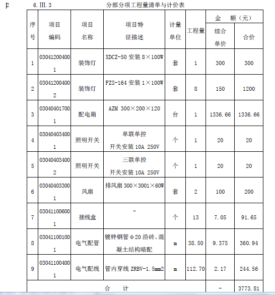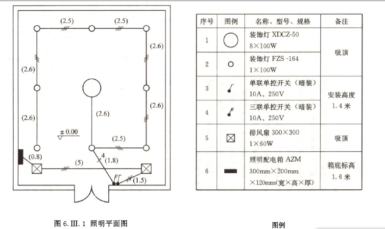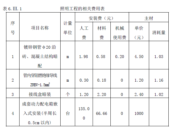 III.电气和自动化控制工程 某贵宾室照明系统中1 回路如图6.Ⅲ.1 所示。表6.Ⅲ.1 为计算该照明工程的相关费用: 该工程的人工单价...