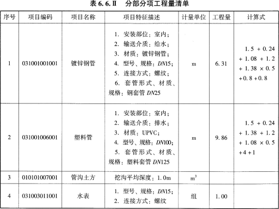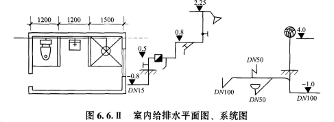 某室内给排水安装工程,如图6.6.Ⅱ所示。给水管道为镀锌钢管螺纹连接,排水管道为塑料排水管承插粘接,低水箱坐式大便器,瓷洗手盆,钢管淋浴器,钢套管,墙厚2...