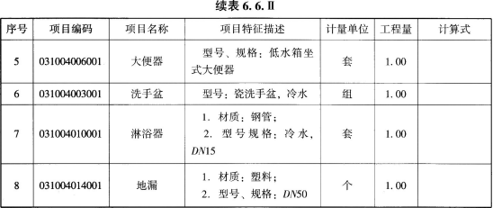 问题 某室内给排水安装工程,如图6.6.Ⅱ所示。给水管道为镀锌钢管螺纹连接,排水管道为塑料排水管承插粘接,低水箱坐式大便器,瓷洗手盆,钢管淋浴器,钢套管,墙厚240mm。排出管长1.5m。 问题: 请按照《通用安装工程工程量计算规范》GB 50856--2013编制和完善分部分项工程量清单,并填入表6.6.Ⅱ。