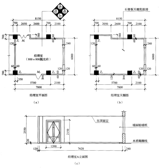 问题 某经理室装修工程如图8.6.I所示。间壁轻隔墙厚120mm,承重墙厚240mm。经理室内装修做法详见表8.6.Ⅰ-1分部分项工程量清单“工作内容”中所列的内容。踢脚、墙面门口侧边的工程量不计算,柱面与墙踢脚做法相同,柱装饰面层厚度50mm。消耗量定额是按《建设工程工程量清单计价规范》的计算规则编制的。 问题: 1.根据图8.6.Ⅰ所示内容和表8.6.Ⅰ-4“分部分项工程量清单”所列项目,依据《建设工程工程量清单计价规范》附录B的计算规则,计算经理室内装修工程量。范围包括:A、C两个立面、柱面(Z1、Z2、Z3)、地面、踢脚线、天棚。将相应的计量单位、计算式及计算结果填入表8.6.Ⅰ-4“分部分项工程量清单”的相应栏目中。 2.根据表8.6.Ⅰ-4所列经理室内装修做法,以及(表8.6.Ⅰ-1~表8.6.Ⅰ-3)《××装饰工程消耗量定额》(节选)的消耗量、预算价格,按《建设工程工程量清单计价规范》中综合单价的内容要求。编制表8.6.Ⅰ-5“分部分项工程量清单综合单价分析表”。管理费按人工费的70%、利润按人工费的50%计算。 (计算结果均保留两位小数)