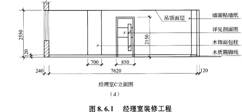 某经理室装修工程如图8.6.I所示。间壁轻隔墙厚120mm,承重墙厚240mm。经理室内装修做法详见表8.6.Ⅰ-1分部分项工程量清单“工作内容”中所列的...