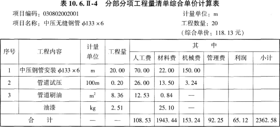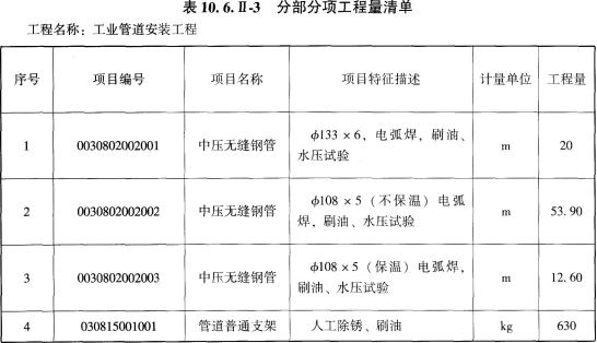 问题 某加压站工艺管道系统如图10.6.Ⅱ。 说明: 1.本图为氧气加压站的部分工艺管道。该管道系统工作压力为3.2MPa。图中标注尺寸标高以“m”计,其他均以“mm”计。 2.管道:采用碳钢无缝钢管,系统连接均为电弧焊;管件:弯头采用成品冲压弯头,三通现场挖眼连接。 3.阀门、法兰:所有法兰均为碳钢对焊法兰;阀门型号除图中说明外,均为J41H—25,采用对焊法兰连接。 4.管道支架为普通支架,其中:φ133×6管支架共5处,每处26kg;φ108×5管支架共20处,每处25kg。 5.管道安装完毕作水压试验,然后对L3-φ108×5管道焊口均作X光射线无损探伤,胶片规格为80×150,其焊口数量为6个。 6.管道安装就位后,所有管道外壁均刷油漆。缓冲罐引出管线13-φ108×5采用岩棉管壳(厚度为60mm)作绝热层,外缠铝箔保护层。 相关费用计算条件如下: (1)部分分部分项工程量清单项目的工料单价见表10.6.Ⅱ-1。 (2)无缝钢管φ133×6的每10m工程量耗用9.41m管材,其单价为100元/m;管道刷油每10m2耗用3kg油漆,其单价为10元/kg。 (3)管理费、利润分别按人工费的85%和60%计。 问题: 1.依据工程量清单计算规则计算分部分项工程量,并将工程量和计算过程填人表10.6.Ⅱ-2的相应栏目内。 2.依据《通用安装工程工程量计算规范》GB 50856--2013编列出管道(编码:030802002)及管道支架(编码:030815001)的分部分项工程量清单,并填人表10.6.Ⅱ-3中。 3.根据表10.6.Ⅱ-3中的内容,计算无缝钢管φ133×6项的分部分项工程量清单综合单价,并填入表10.6.Ⅱ-4中。 (计算结果均保留两位小数)