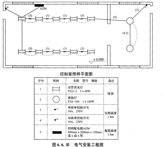 某控制室照明系统中某回路如图图6.Ⅲ所示。 说明: 1.照明配电箱AZM由本层总配电箱引来,配电箱为嵌入式安装。 2.管路均为镀锌钢管φ15沿墙...