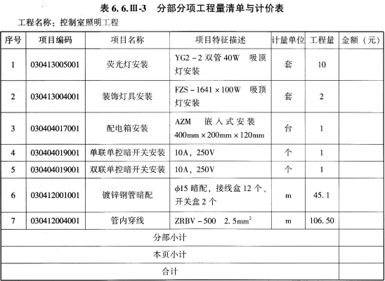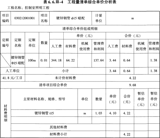 问题 某控制室照明系统中某回路如图图6.Ⅲ所示。 说明: 1.照明配电箱AZM由本层总配电箱引来,配电箱为嵌入式安装。 2.管路均为镀锌钢管φ15沿墙、楼板暗配,顶管敷管标高4.50m,管内穿绝缘导线ZRBV-5002.5mm2。 3.配管水平长度见括号内数字,单位为m。 计算该照明工程的相关定额数据见6.Ⅲ-1表。 人工单价为41.80元/工日,管理费和利润分别按人工费的30%和10%计。 问题: 1.根据图示内容和《通用安装工程工程量计算规范》GB 50856--2013的相关规定计算工程量,管线工程量计算式填入答题纸上指定的位置,并根据以下给定的统一项目编码编制分部分项工程量清单及计价表(不计算计价部分)。 2.假设镀锌钢管φ15暗配的清单工程量为50m,其余条件不变,依据上述相关定额数据,计算分析镀锌钢管φ15暗配项目的综合单价,并填入“工程量清单综合单价分析表”中。 (金额保留两位小数,其余保留三位小数)