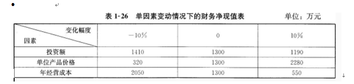 解析 问题1: 问题2: 第3年的经营成本=900-100-30.98=761.1(万元) 第4年的经营成本=1500-100-32.75-24=1343.25(万元) 第10年的经营成本=1500-100-24=1376(万元) 问题3: 投资额:(1190-1300)/1300/10%=-0.85(或0.85%) 单位产品价格:(320-1300)/1300/(-10%)=7.54(或7.54%) 年经营成本:(550-1300)/1300/10%=-5.77(或5.77%) 敏感性排序为:单位产品价格,年经营成本,投资额。 问题4: 单位产品价格的临界点为:1300×10%/(1300-320)=-13.27% [或1300×10%/(2280-1300)=13.27%] 单因素敏感性分析图如图1—17所示。