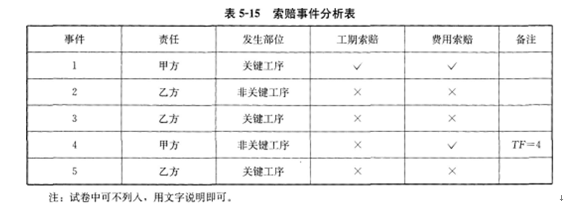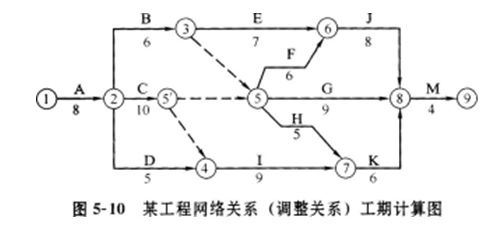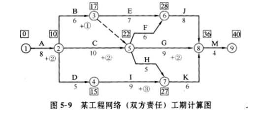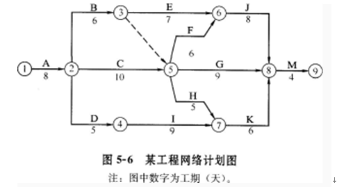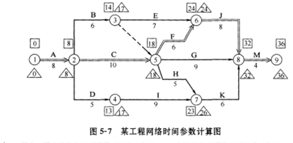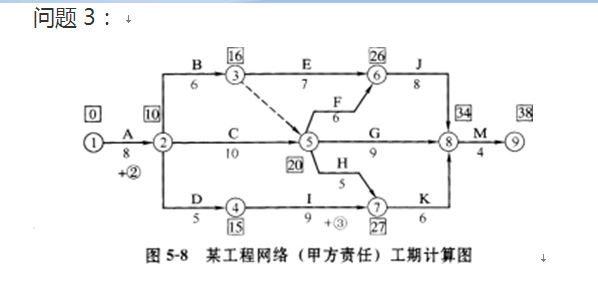 解析 问题2: 事件1:发生在关键工序,甲方责任按计划工期8天平均每天完成50m3,现实际工程量增加100m3,默示工期增加2天应予顺延。土方量由,100m3增加到500m3,即[500=400×(1+15%)+40]应增加工程费为:80×60+80×0.9×40=7680(元)。 事件4:发生在非关键工序I,甲方延误责任,虽延误3天(本工序TF=4,其紧后工序为K,TF=3)对总工期无影响故工期不予补偿,费用补偿3万元。 事件2、3、5:均为乙方责任,故不予工期补偿和费用补偿。 包含甲方责任延误工期时间的甲方责任工期为38天。 B工作增加工程量100m3默示工期增加2天。 包含甲、乙双方延误时间的实际工期为40天,排除甲方责任工期38天,剩余2天,即为由于乙方责任延误工期。故乙方应向甲方交付误工费2万元。 问题4: C、I共用1台设备可用图5-5表示,C工序最早开工时间TES=8,I工序最早开工时间了TES=18,最早完工时间TEF=27,故正常情况下起重机在场时间为27-8=19(天)。 在甲方延误责任的前提下,C工序TES=9,TEF=19;I工序TES=19,TEF=31;故起重机在场时间为31-9=22(天),(22-19=3)比正常情况下增加了3天。 若起重机为乙方自有,应分别按原定台班费定额(工程量增加)或设备折旧值(窝工)给予费用 补偿。若起重机为乙方租赁应分别按原定台班费定额或租金给予费用补偿。 费用补偿时不应支付机上工作人员工资费用,因此项费用已包含在机械台班费定额中。