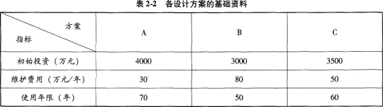 问题 某大型综合楼建设项目,现有A、B、C三个设计方案,经造价工程师估算的基础资料如表2-2所示,基准折现率5%。 问题:使用最小费用法,选择最优方案。