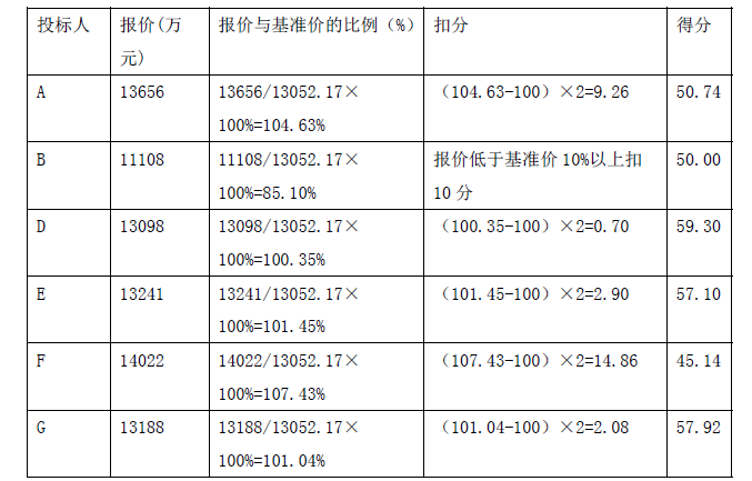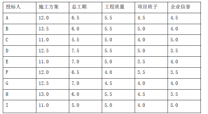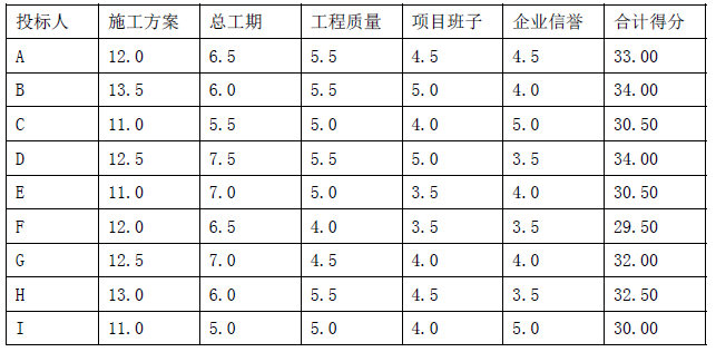 问题 某国家重点项目工程采用公开招标方式进行招标,经资格预审后共有A、B、C、D、E、F、G、H、I 九家投标单位满足资格预审文件要求。该工程采用两阶段评标法评标,评标委员会由5 名委员组成。招标招标文件中规定采用综合评分法进行评标,具体的评标标准如下: 第一阶段评技术标。 技术标共计40 分,其中施工方案15 分,总工期8 分,工程质量6 分,项目班子6 分,企业信誉5 分。技术标各项内容的得分由评标委员会成员打分得到。 表1-1 为各投标人施工方案、总工期、工程质量、项目班子、企业信誉得分汇总表。 投标及评标时发生如下事件: 事件1:投标人C 未按招标文件要求提交投标保证金; 事件2:投标人H 和投标人I 的投标报价呈现规律性差异; 事件3:投标人F 的报价低于社会的平均成本。 2.第二阶段评商务标。 商务标共计60 分。以有效标报价的算术平均数为基准价,以基准价为满分(60 分),报价比基准价每下降1%,扣1 分,最多扣10 分;报价比基准价每增加1%,扣2 分,扣分不保底。 表1-2 为各投标人的报价汇总表。(单位:万元) 计算结果保留两位小数。 问题: 1.根据招标文件中的评标标准和方法,通过表格填写的方式确定三名中标候选人,并排出顺序。 2.依法必须进行招标的项目,在什么情况下招标人可以确定非排名第一的中标候选人为中标人?