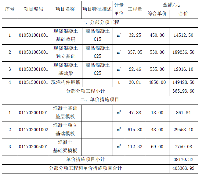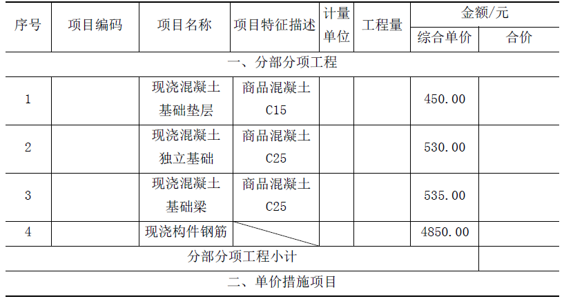 解析 问题1: 表3-24 工程量计算表 问题2: 表3-25 分部分项工程和单价措施项目清单与计价表 问题3: 此三项模板费用应计入相应的混凝土工程项目的综合单价中。 混凝土垫层的综合单价调整为: 问题4: 该架空运输坡道土建工程基础部分总包方与商品混凝土供应方混凝土结算用量为: