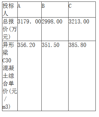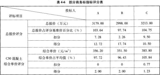 解析 问题(1): ①要求投标人领取招标文件时递交投标保证金和施工图纸费不妥,因为投标保证金应在递交投标文件时递交,施工图纸可以收押金,但不能收费用。 ②投标截止时间不妥,因为根据规定,从招标文件发出到投标截止时间不能少于20天。 ③踏勘现场安排不妥,因为根据规定,招标人不得单独或者分别组织任何一个投标人进行现场踏勘。 ④投标预备会上对施工图纸不做任何解释不妥,因为招标人应就图纸进行交底和解释。 问题(2): ①总报价平均值=(3179+2998+3213)/3=3130(万元) 评标基准价=3130×(1-2%)=3067.4(万元) ②异形梁C30混凝土综合单价报价平均值=(356.20+351.50+385.80)/3=364.50(元/m3) 总报价和C30混凝土综合单价评分见表4-6。 问题(3): 投标人A的总得分:30+12.72+32=74.72(分) 投标人B的总得分:35+17.74+29=81.74(分) 投标人C的总得分:37+10.50+28=75.50(分) 所以第一中标候选人为B投标人。 问题(4): (1)招标人向主管部门提交的书面报告时问及内容不妥,应该是自发出中标通知书之日起15日内,向有关行政监督部门提交报告招投标情况的书面报告。 (2)招标人仅向中标人发出中标通知书不妥,还应将中标结果通知未中标人。 (3)招标人通知未中标人的时间不妥,应在向中标人发出中标通知书的同时通知未中标人。 (4)退还未中标人的投标保证金时间不妥,招标人应在与中标人签订合同后的5个工作日内向未中标人退还投标保证金。