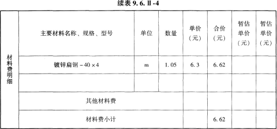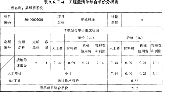 问题 某照明系统如图9.6.Ⅱ,工程相关定额费用和清单编码如表9.6.Ⅱ-1、表9.6.Ⅱ-2。 接地母线定额用量增加系数为3.9%,母线主材损耗率5%,接地极角钢的损耗率3%。 说明: 1.照明配电箱MX为嵌入式安装,箱体尺寸:600mm×400mm×200mm(宽×高×厚),安装高度为下口离地面1.6m。 2.管线均为镀锌钢管φ20沿砖、顶板内暗配,顶管内标高为4m;管内穿阻燃绝缘导线为ZR-BV1.5mm2。 3.接地母线采用-40×4镀锌扁钢,埋深0.7m,由室外进入外墙皮后的水平长度为1m。键入配电箱内长度为0.5m。室内外地平无高差。 4.单联单控暗开关安装高度为下口离地1.4m。 5.接地电阻要求小于4Ω。 6.配管水平长度见图括号内数字,单位为m。 问题: 1.依据《建筑工程工程量清单计价规范》GB 50500--2013,计算接地母线、配管、配线工程量,并填写表9.6.Ⅱ-3。 2.计算接地母线的工程量清单综合单价,填写表9.6.Ⅱ-4。管理费、利润按人工费的55%和45%计算。