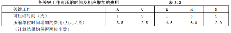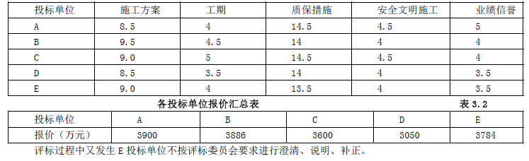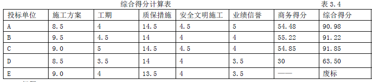 问题 案例分析三 【背景资料】 某市政府拟投资建一大型垃圾焚烧发电站工程项目。该项目除厂房及有关设施的土建工程外,还有全套进口垃圾焚烧发电设备及垃圾处理专业设备的安装工程。厂房范围内地质勘察资料反映地基地质条件复杂,地基处理采用钻孔灌注桩。招标单位委托某咨询公司进行全过程投资管理。该项目厂房土建工程有A、B、C、D、E 共5 家施工单位参加投标,资格预审结果均合格。招标文件要求投标单位将技术标和商务标分别封装。评标原则及方法如下: 1.采用综合评估法,按照得分高低排序,推荐三名合格的中标候选人。 2.技术标共40 分,其中施工方案10 分,工程质量及保证措施15 分,工期、业绩信誉、安全文明施工措施分别为5 分。 3.商务标共60 分。 (1)若最低报价低于次低报价15%以上(含15%),最低报价的商务标得分为30 分,且不再参加商务标基准价计算; (2)若最高报价高于次高报价15%以上(含15%),最高报价的投标按废标处理; (3)人工、钢材、商品混凝土价格参照当地有关部门发布的工程造价信息,若低于该价格10%以上时,评标委员会应要求该投标单位作必要的澄清; (4)以符合要求的商务报价的算术平均数作为基准价(60 分),报价比基准价每下降1%扣1 分,最多扣10 分,报价比基准价每增加l%扣2 分,扣分不保底。 各投标单位的技术标和商务报价见表3.1、3.2。 各投标单位技术标得分汇总表表3.1 问题: 1.按照评标办法,计算各投标单位商务标得分。 2.按照评标办法,计算各投标单位综合得分,并把计算结果填入答题纸表3.1 中。 3.推荐合格的中标候选人,并排序。 4.假设某施工单位决定参与此工程的投标。其方案的费用为C = 150 + 3T。若该工程的合理工期为60 周,该施工单位相应的估价为1653 万元。招标文件规定,评标采用“经评审的最低投标价法”,且规定,施工单位自报工期小于60 周时,工期每提前1 周,其总报价降低2 万元作为经评审的报价,则施工单位的自报工期应为多少? 相应的经评审的报价为多少?若该施工单位中标,则合同价为多少? 各关键工作可压缩的时间及相应增加的费用见表3.3。 假定所有关键工作压缩后不改变关键线路。