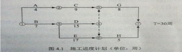 问题 某工程施工合同中规定,合同工期为30周,合同价为827.28万元,管理费为直接费(分部分项工程和措施项目的人工费、材料费、机械费之和)的18%,利润率为直接费、管理费之和的5%,因通货膨胀导致价格上涨时,业主只对人工费、主要材料费和机械费(三项费用占合同价的比例分别为22%,40%和9%,)进行调整,因设计变更产生的新增工程,业主既补偿成本又补偿利润。 该工程的D工和H工作安排使用同一台施工机械,机械每天工作一个台班,机械台班单价为1000元/台班,台班折旧费为600元/台班,施工单位编制的施工计划,如图4.1所示。 施工过程中发生如下事件: 事件1:考虑物价上涨因素,业主与施工单位协议对人工费、主要材料费和机械费分别上调5%、6%和3%。 事件2:因业主设计变更新增F工作,F工作为D工作的紧后工作,为H工作的紧前工作,持续时间为6周,经双方确认,F工作的直接费(分部分项工程和措施项目的人工费、材料费和机械费之和)为126万元,规费为8万元。 事件3:G工作开始前,业主对G工作的部分施工图纸进行修改,由于未能及时提供给施工单位,致使G工作延误6周,经双方协商,对仅因业主延迟提供的图纸而造成的工期延误,业主按原合同工期和价格确定分摊的每周管理费标准补偿施工单位管理费。 上述事件发生后,施工单位在合同规定的时间内向业主提出索赔并提供了相关资料。 【问题】 1、事件1中,调整后的的合同价款为多少万元 2、事件2中,若增值税综合税率为10%,应计算F工作的工程价款为多少万元 3、事件2发生后,以工作表示的关键线路是哪一条列式计算应批准延长的工期和可索赔的费用(不含F的工程价款,规费以人工费为基数计算)。 4、假设原合同价中规费38万,应计增值税为27.8万元,计算原合同工期分摊的每周管理费应为多少万元(以原合同中管理费为基数分摊)发生事件2和事件3后,项目最终的工期是多少周业主应批准补偿的管理费为多少万元(列出具体的计算过程,计算结果保留两位小数。)