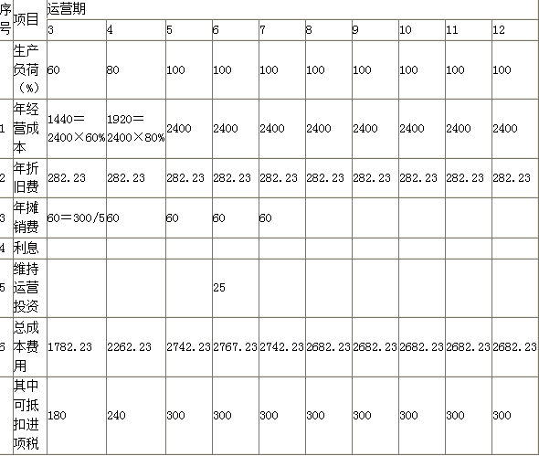 解析 【1】 固定资产折旧费=(3865-300)×(1-5%)÷12=282.23(万元) 固定资产余值=残值+年固定资产折旧费×(折旧年限-运营年限)=(3865-300)×5%+282.23×2=742.71(万元) 表1-6 某项目总成本费用估算表 单位:万元 【2】 表1-7 项目投资现金流量表 计算调整所得税: 调整所得税=(营业收入(不含销项税)-经营成本(不含进项税)-增值税附加-折旧-摊销-维持运营投资+补贴收入)×25% 第3年调整所得税=(2490-1260-19.80-282.23-60+200)×25%=266.99(万元) 第4年调整所得税=(3320-1680-26.40-282.23-60)×25%=317.84(万元) 第5年调整所得税=(4150-2100-33-282.23-60)×25%=418.69(万元) 第6年调整所得税=(4150-2100-33-282.23-60-25)×25%=412.44(万元) 第7年调整所得税=(4150-2100-33-282.23-60)×25%=418.69(万元) 第8年至第12年调整所得税=(4150-2100-33-282.23)×25%=433.69(万元) 【3】 静态投资回收期=(累计净现金流量出现正值年份-1)+丨出现正值年份上年累计净现金流量累计值丨/出现正值年份当年净现金流量=(6-1)+667.72/1579.56=5+0.42=5.42(年) 项目静态投资回收期为5.42年小于6年,项目可行。 【4】 计算该项目的净现值为4128.50万元,大于0,项目可行。