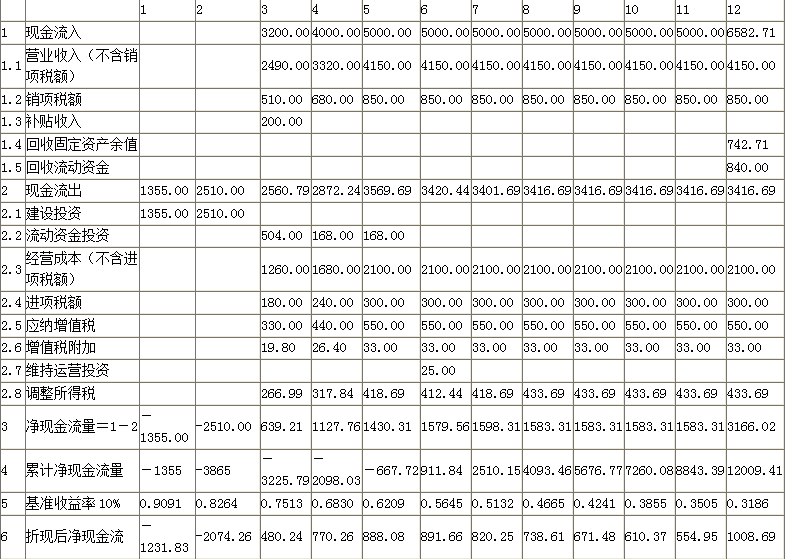 问题 背景资料: 某企业拟全部采用自有资金建设一个工业项目,该项目为当地政府重点扶持项目,政府承诺在项目投产的第1年给予项目启动经费200万元。其他基础数据如下: 1.建设投资3865万元,建设期2年,第1年完成投资1355万元,第2年完成投资2510万元,运营期10年。 2.建设投资中有300万元形成其他资产,其余部分构成固定资产;其他资产摊销年限为运营期前5年,固定资产折旧按直线法计算,折旧年限为12年,残值率为5%。 3.项目运营后第3年开始达到正常生产能力,销售收入为5000万元(含销项税850万元),运营前2年的销售收入分别为正常生产年份的60%及80%,该项目的增殖税附加税率6%。 4.正常生产年份经营成本为2400万元(含进项税300万元),运营期前2年的经营成本分别为正常生产年份的60%及80%。 5.运营3年后,预计需投入25万元更新设备配件,才能维持以后的正常运营需要,该维持运营投资按当期费用计入年度总成本。 6.流动资金总额为840万元,在运营期前3年分别投入504万元、168万元、168万元,运营期末全部收回。 7.其他有关资料如下:调整所得税税率25%,行业基准收益率10%,基准回收期6年。 <1>、补充完成总成本费用表。 表1-4 某项目总成本费用估算表 单位:万元 <2>、补充完成拟建项目投资现金流量表。 拟建项目投资现金流量表1-5。 表1-5 项目投资现金流量表 <3>、计算项目的静态投资回收期并分析拟建项目的可行性。 <4>、计算项目的财务净现值并分析拟建项目的可行性。