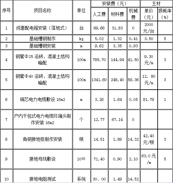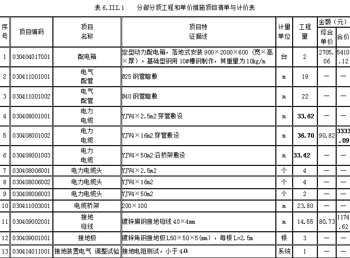 解析 【1】 (1)钢管Φ25工程量计算:10+7+(0.2+0.1)×2+(0.2+0.3+0.2)×2=19(m)    (2)钢管Φ40工程量计算:8+12+(0.2+0.1)×2+(0.2+0.3+0.2)×2=22(m)    (3)电缆YJV4×16工程量[8+12+(0.2+0.1)×2+(0.2+0.3+0.2)×2+配电箱处预留(0.9+2.0)×2+配电箱处终端头预留1.5×2+设备处预留1×2+设备处终端头预留1.5×2)×(1+2.5%)=[22+5.8+3+2+3]×1.025=35.8×1.025=36.70m (4)电缆YJV4×2.5工程量[10+7+(0.2+0.1)×2+(0.2+0.3+0.2)×2+配电箱处预留(0.9+2.0)×2+配电箱处终端头预留1.5×2+设备处预留1×2+设备处终端头预留1.5×2)×(1+2.5%)=[19+5.8+3+2+3]×1.025=32.8×1.025=33.62m (5)电缆YJV4×50工程量[22+[3-(2+0.1)]×2+配电箱处预留(0.9+2.0)×2+配电箱处终端头预留1.5×2)]×(1+2.5%)=[23.8+5.8+3]×1.025=32.6×1.025=33.42m   (6)电缆桥架200×100工程量计算:22+[3-(2+0.1)]×2=23.8(m)    (7)接地母线工程量计算:    接地母线图示长度=0.8+0.7+0.5+2+5+5=14m    考虑3.9%的附加长度,总长度为=14×1.039=14.55m (8)电缆头制作安装工程量: 电缆YJV4×50每根2个电缆头=2个 电缆YJV4×16(2根电缆)2×2=4个 电缆YJV4×2.5(2根电缆)2×2=4个。 【2】 见下表。 【2】 (1)配电箱综合单价计算:    配电箱底盘尺寸(0.9+0.6)×2=3(m)    基础型钢10#槽钢的净量:3m×10kg/m=30(kg) 消耗量为30×(1+5%)=31.5(kg) [69.66+31.83+0+69.66×(55%+45%)+2000]+{[5.02+1.32+0.41+5.02×(55%+45%)]×30+31.5×3.5}+{[9.62+3.35+0.93+9.62×(55%+45%)]×3} =2171.15+(353.1+110.25)+70.56=2705.06(元/台) 说明: 配电箱项目特征包括:名称,型号,规格,基础形式、材质、规格,接线端子材质、规格、端子板外部接线材质、规格,安装方式。   工作内容包括:本体安装,基础型钢制作、安装,焊、压接线端子,补刷(喷)油漆,接地。    本题动力配电箱综合单价的计算就是一台配电箱的本体安装,相应的此台配电箱的基础型钢制作、基础型钢安装三项工作内容的费用之和。 (2)电力电缆YJV×16穿管敷设综合单价计算:    3.26+1.64+0.05+3.26×(55%+45%)+81.79×(1+1%)=90.82(元/m) (3)接地母线综合单价计算:[71.4+0.9+2.1+71.4×(55%+45%)]×0.1+63×(1+5%)=14.58+66.15=80.73(元/m) 【3】 各项费用的计算过程如下:    (1)分部分项工程清单计价合计=100+100×10%×(54%+46%)=110.00(万元)    (2)措施项目清单计价合计:    1)脚手架搭拆费=100×10%×8%+100×10%×8%×25%×(54%+46%)=0.8+0.2=1.00(万元) 2)安全防护、文明施工措施费=2.00(万元)    3)其他措施项目费=3.00(万元) 措施项清单计价合计=1+2+3=6.00(万元)    (3)其他项目清单计价合计=暂列金额+专业工程暂估价+总承包服务费=1+2+2×3%=3.06(万元) (4)规费=(分部分项工程费+措施项目费+其他项目费)×5%=(110+6+3.06)×5%=5.953(万元) (5)税金=(110+6+3.06+5.953)×11%=125.013×11%=13.751(万元)    (6)投标报价合计=110+6+3.06+5.953+13.751=138.764(万元)