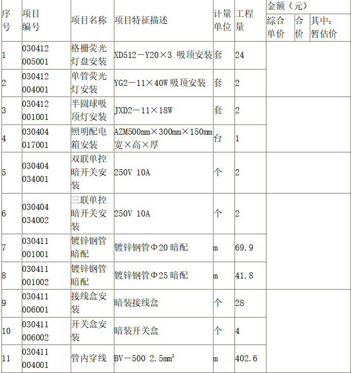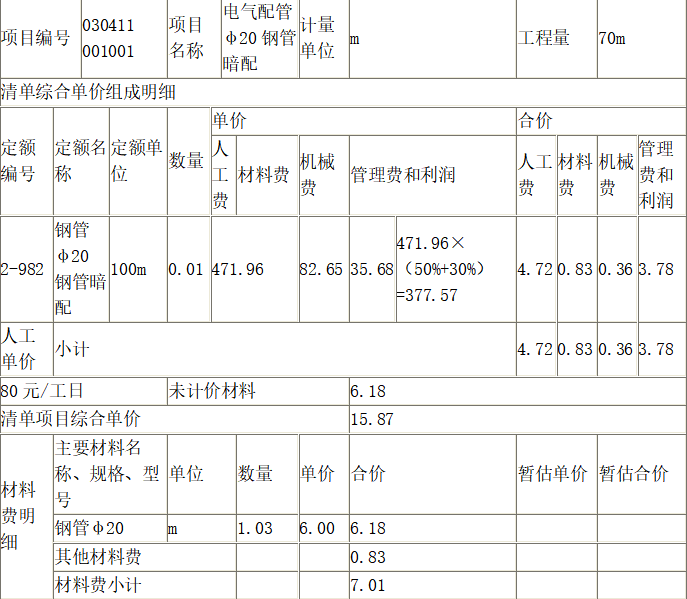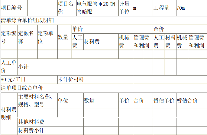 问题 工程背景资料如下: (1) 图6.Ⅲ所示为某综合楼底层会议室的照明平面图。 (2)照明工程的相关定额见下表 (3)该工程的人工费单位为80元/工日,管理费和利润分别按人工费的50%和30%计算。 (4)相关分部分项工程量清单项目统一编码见下表: 说明: 1.照明配电箱AZM电源由本层总配电箱引来。 2.管路为镀锌电线管Φ20或Φ25沿墙、楼板暗配,顶管敷设标高除雨篷为4m外,其余均为5m。管内穿绝缘导线BV-500 2.5mm2。管内穿线管径选择:3根线选用Φ20镀锌电线管;4-5根线选用Φ25镀锌电线管。所有管路内均带一根专用接地线(PE线)。 3.配管水平长度见图6.Ⅲ括号内数字,单位为m。 <1> 、按照背景资料1-4和图6.Ⅲ所示内容,根据《建设工程工程量清单计价规范》(GB50500-2013)和《通用安装工程工程量计算规范》(GB50856-2013)的规定,分别列式计算管、线工程量,将计算结果填入答题纸上,并在答题纸表6.Ⅲ.1中,编制该工程的“分部分项工程和单价措施项目清单与计价表”。 分部分项工程和单价措施项目清单与计价表 <2> 、设定该工程镀锌电线管Φ20暗配的清单工程量为70m,其余条件均不变,根据上述相关定额计算镀锌电线管Φ20暗配项目的综合单价,并填入答题纸表6.Ⅲ.2“综合单价分析表”中。 (保留两位小数) 综合单价分析表