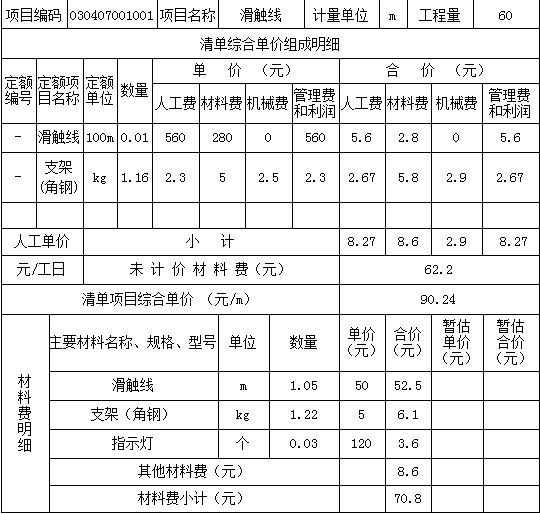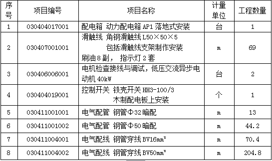 解析 问题1: 1.钢管Φ32工程量计算: (0.1+0.2+7+0.2+1.5)+(6-1.5-0.5)=9+4=13(m) 2.钢管Φ50工程量计算: 25+17+(0.2+0.5+0.1+0.2+0.1)×2=44.2(m) 3.导线BV16mm2工程量计算: 13×4+(1.7+0.8+0.5/2+0.3+0.5/2+0.3+1) ×4=70.4(m) 4.导线BV50mm2工程量计算: 44.2×4+(1+1.7+0.8) ×4×2=204.8(m) 5.角钢滑触线L50×50×5工程量计算: (7×3+1+1)×3=69(m) 表6.Ⅲ.1 分部分项工程量清单 问题2: 表6.Ⅲ.2 分部分项工程量清单综合单价分析表