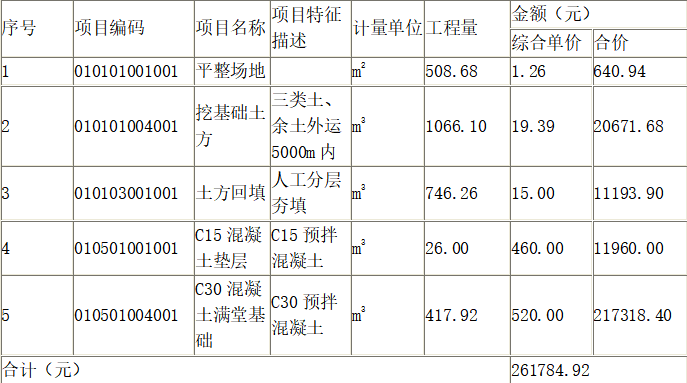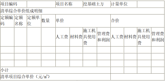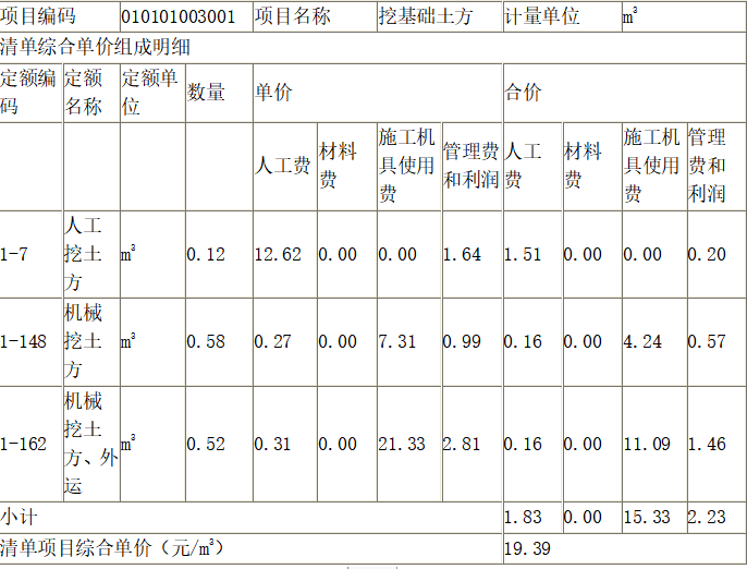 解析 【1】 表6.I.1 工程量计算表 【2】1.土方工程量计算过程: (1)开挖土方量:V=1/3×3.14×4.0×[(9.0+0.1+0.3)2+(9.4+4.0×0.33)2+9.4×10.72] +3.14×9.4×9.4×0.1=1300.69(m3) (2)回填土方量:V=1300.69-26.00-417.92-3.14×4.0×4.0×2.2=746.24(m3) (3)外运余土方量:V=1300.69-746.24=554.45(m3) 2.综合单价分析表中数量计算过程: (1)人工挖土方就地堆存:V=1300.69×10%/1066.10=0.12(m3) (2)机械挖土方就地堆存:V=(1300.69-1300.69×10%-554.45)/1066.10=0.58(m3) (3)机械挖土外运5000m内:V=554.45/1066.10=0.520(m3) 表6.I.2 工程量清单综合单价分析表 工程名称:钢筋烟囱 【3】 表6.I.3 分部分项工程量清单与计价表