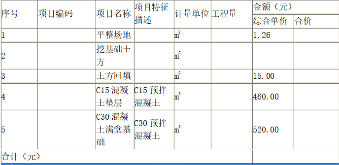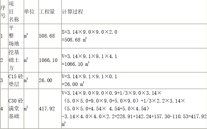 问题 某钢筋混凝土圆形烟囱基础设计尺寸,如图6.1所示。其中基础垫层采用C15混凝土,圆形满堂基础采用C30混凝土,地基土壤类别为三类土,土方开挖底部施工所需的工作面宽度为300mm,放坡系数为1:0.33,放坡自垫层上表面计算。 <1> 、根据上述条件,按《建设工程工程量清单计价规范》(GB 50500-2013)的计算规则,在答题纸表6.I.1“工程量计算表”中,列式计算该烟囱基础的平整场地、挖基础土方、垫层和混凝土基础工程量。平整场地工程量按满堂基础底面积乘2.0系数计算,圆台体体积计算公式为V=1/3×h×π×(r12+r22+r1×r2)。 6.I.1 工程量计算表 <2> 、根据工程所在地相关部门发布的现行挖、运土方预算单价,见表6.I.1“挖、运土方预算单价表”,施工方案规定,土方按90%机械开挖、10%人工开挖,用于回填的土方在20m内就近堆存,余土运往5000m范围内指定地点堆放。相关工程的企业管理费按工程人材机费用之和的7%计算,利润按工程人材机费用之和的6%计算。编制挖基础土方(清单编码为010101003)的清单综合单价,填入答题纸表6.I.2“工程量清单综合单价分析表”。 表6.I.1  挖、运土方预算单价表 单位:m3 表6.I.2 工程量清单综合单价分析表 工程名称:钢筋烟囱 <3> 、利用第1、2问题的计算结果和以下相关数据,在答题纸表6.I.3“分部分项工程量清单与计价表”中,编制该烟囱基础分部分项工程量清单与计价表。已知相关数据:①平整场地,编码010101001,综合单价1.26元/m2;②挖基础土方,编码010101004;③土方回填,人工分层夯填,编码010103001,综合单价15.00元/m3;④C15混凝土垫层,编码010501001,综合单价460.00元/m3;⑤C30混凝土满堂基础,编码010501004;综合单价520.00元/ m3。 表6.I.3 分部分项工程量清单与计价表