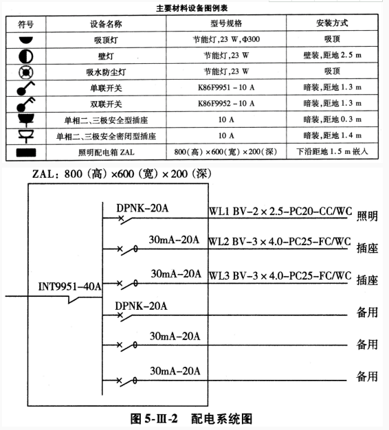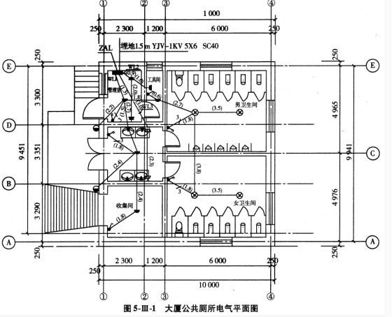 工程背景资料如下: 1.图5.Ⅱ.1为大厦公共厕所电气平面图,图5.Ⅱ.2为配电系统图及主要材料设备图例表。该建筑物为砖、混凝土结构,单层平屋面,室内净...