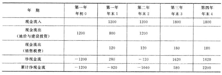 问题 共用题干某房地产开发公司购买一宗土地进行住宅开发,地价为1200万元,一次性付清。预计建设期为两年,第一年建设投资800万元,第二年建设投资1200万元。住宅总建筑面积为15000m2,预计平均售价为4000元/m2销售计划为:建设期每年分别预售房屋的20%,现房销售期两年分别销售房屋的30%,销售税费等占销售收入的10%,基准收益率为10%(地价发生于年初,其余现金流量发生在年末)。