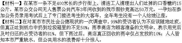 选项 上述材料反映的现象说明()。 A.部分公众缺乏基本的公德意识 B.一些公众了解相应的公德规范,但在实践中却不作为 C.对违反社会公德的现象和行为,没有形成人人谴责的舆论氛围 D.现行的行政和法律措施,助长了公德缺失现象的滋生与蔓延