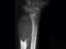 男性,17岁,近2年来感右前臂疼痛,肿胀,2周前由于疼痛加剧,查体右前臂压痛明显,皮肤稍显红肿,请结合所提供图像,选择最佳选项 ( )A、软骨...