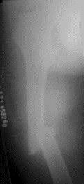 病历摘要: 患者×××,男性,34岁,车祸致伤右大腿后肿胀、疼痛、畸形,活动受限2小时。查体:右大腿肿胀,成角畸形,骨连续性中断,右足背动脉搏动存在,右足...