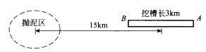 问题 某耙吸挖泥船施工的工程,其挖槽中心至抛泥区距离15km,挖槽长度3km,该船以5000m3舱容施工,施工土质密度1. 85t/m3,重载航速9kn,轻载航速11kn,挖泥航速3kn,调头、抛泥时间8min,一次挖槽长度挖泥满舱载重量7000t。(如下图所示) 问题: (1)计算该船的泥舱装载土方量。 (2)如图由A挖起至B止和由B挖起至A止哪一种安排更合理些?