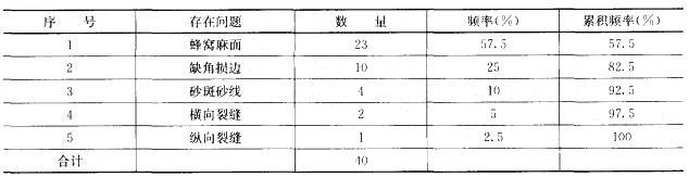 问题 某航道整治工程设计有大量的水上沉排,沉排结构采用土工织物上用混凝土预制块压载,承包商在接到项目后开始进场有关材料,并按规定送检,合格后立即开展了混凝 土块的预制。 项目经理部的质检人员定期对预制质量进行检査,在日常检査的500块中,发现其中存在如下表中的问题。 问题: (1)宜选择哪种方法来分析存在的质量问题? (2)产品主要质量问题是什么?若你是该工程的项目经理,应如何处理?
