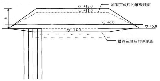 解析 7m在原地面(+5.0m)以上最终堆载高7m,对原地面(+5.0m)的荷载为112kPa; 16×h-16×2 = 80,h= 7m。 加固完成后,卸载至+6.0m(设计使用标高);+6.0m地面的预压荷载为16×5=80kPa。 原地面+5.0m沉降至+ 4.0m,其有效使用荷载为80kPa。