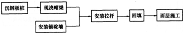 解析 1.本工程主体施工的流程如下: 2. 钢板桩沉桩采用的沉桩工艺主要包括: (1)设置导向梁(架); (2)采用一次沉桩或多次往复沉桩方法; a.一次沉桩:每1~2根桩一次打到设计标高; b.往复沉桩:以若干桩为一批,先插立在导梁(架)内,沉桩时先沉两端头1~2根桩,后沉中间其余桩。 3. 沉桩过程中可能出现的异常情况及采取的措施: (1)沿板桩墙轴线方向垂直度超标:采用楔形桩方法纠偏; (2)板桩偏移轴线产生平面扭转:在后续沉桩中逐根纠正; (3)沉板桩时将邻近已沉桩“带下”或“上浮”,对“带下”板桩,后沉桩桩顶标高适当提高;对“上浮”板桩复打至设计标高; (4)脱榫或不连锁现象,应与设计单位研究处理。 4. 安装拉杆应重点控制: (1)拉杆应搁置在垫平的垫块上; (2)拉杆连接铰的转动轴线应位于水平面上; (3)在帽梁混凝土强度达到设计强度且锚碇墙前回填完成后方可张拉; (4)张紧拉杆时应使拉杆具有设计要求的初始应力; (5)拉杆安装完成后,对防护层进行检查,对涂层缺漏、损坏处进行修补。