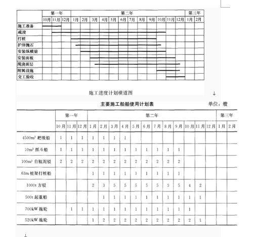问题 背景资料 某海港新建顺岸式码头长802m,宽40m。码头岸坡、港池及航道疏浚工程量160万m3。岸坡土质为淤泥质黏土,设计坡比1:4,坡面为块石护面。码头采用声1000mm PHC桩基础,现浇混凝土桩帽,上部结构为预制纵横梁及面板、现浇码头面层。本工程所有预制构件均由业主按需供应。 工程资料显示,本工程所在地每年6~9月为台风多发期,在该工程附近有一处防台锚地。本工程所用工程船舶自航2h、拖航3h可到达该锚地。经业主等单位批准的施工组织设计中,关于施工进度及主要船舶使用计划分别见下图、下表。所配拖轮均具有拖带大型船舶能力,每个拖轮一次只能拖带任何一艘非自航船舶,1000m3自航泥驳只具有拖带一艘1000t方驳的能力。本工程所配船舶设备运行正常,性能良好。 问题 1.在本工程防台预案中,有哪些船舶需到防台锚地避风?其中拖带船几艘?被拖带船几艘?怎样安排拖带与被拖带船舶较合理?拖带防台的最迟起航时间是多少? 2.在大型施工船舶拖航和调遣时,应由谁担任该船组的拖航总指挥?其职责是什么? 3.在台风威胁中项目经理部应做哪些防台工作? 4.项目经理部在编制防台预案中,针对本工程哪些工序应加强制定防台措施?