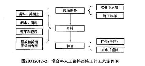 解析 教材P54页 图2B312012-2混合料人工路拌法施工的工艺流程图:可以得出顺序为准备下承层-洒水、闷料-拌和-整形